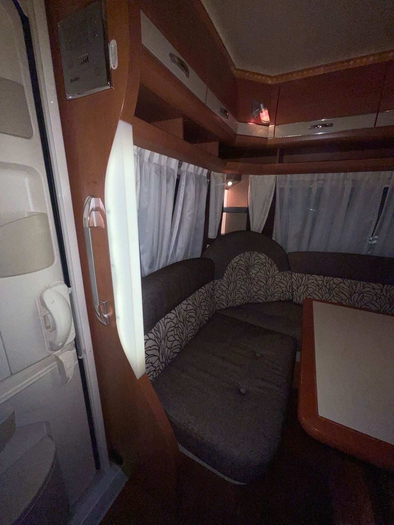 A l’avant de la caravane se trouvent 2 lits simples avec une table de chevet au milieu. Salle de toilettes séparée avec lavabo et toilettes. Beaucoup d’espace de rangement.