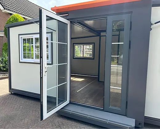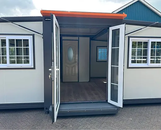 Toilettes: oui; poids individuel: 3350 kg; longueur totale: 5860 mm; largeur totale: 6220 mm; hauteur totale: 2550 mm; description: Equipé de murs et de toiture isolés; salle de bain avec WC et douche; lavabo avec armoire miroir et robinetterie de toilette; plancher de vinyle; système de ventilation (connexion 230V); cadres en plastique avec double vitrage; gouttière de drainage; Bordes; l’eau, l’électricité et le drainage peuvent facilement être connectés est préparé; verrouillable avec clé et cylindre de bouton; dimensions pliées 5860x2110x2550 mm (dimensions transport)