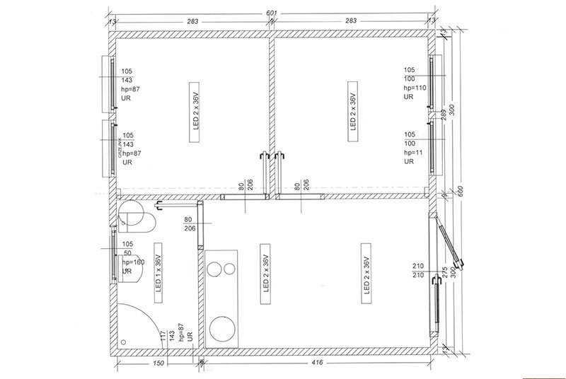 Toit : Tôle lisse galvanisée 0,5 mm à l’extérieur. Pente de la toiture de 2%. Isolation avec laine minérale pressée 100 mm