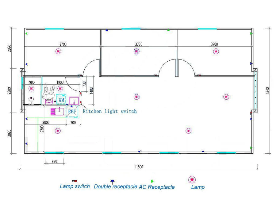 Avec un système électrique entièrement câblé et un tableau électrique de sécurité, vous pouvez être sûr que votre maison est équipée pour tous vos besoins électriques tout en donnant la priorité à la sécurité. Les panneaux EPS de 50 mm garantissent une excellente isolation thermique, tandis que les lumières LED offrent un éclairage économe en énergie dans tout l’espace.