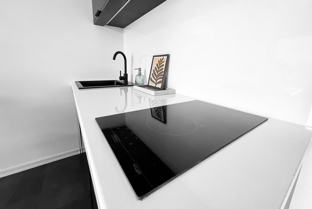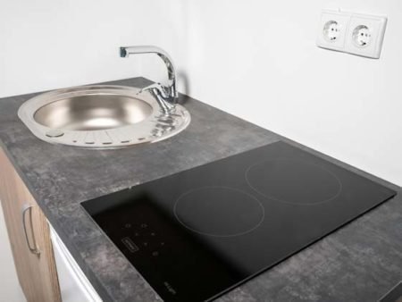 Raccordement eau – eaux usées : L’installation complète est encastrée dans les murs, drain #110 mm. Alimentation en eau PE32 avec vanne pour couper l’eau. Les câbles sont entièrement réalisés en PVC et soudés.
