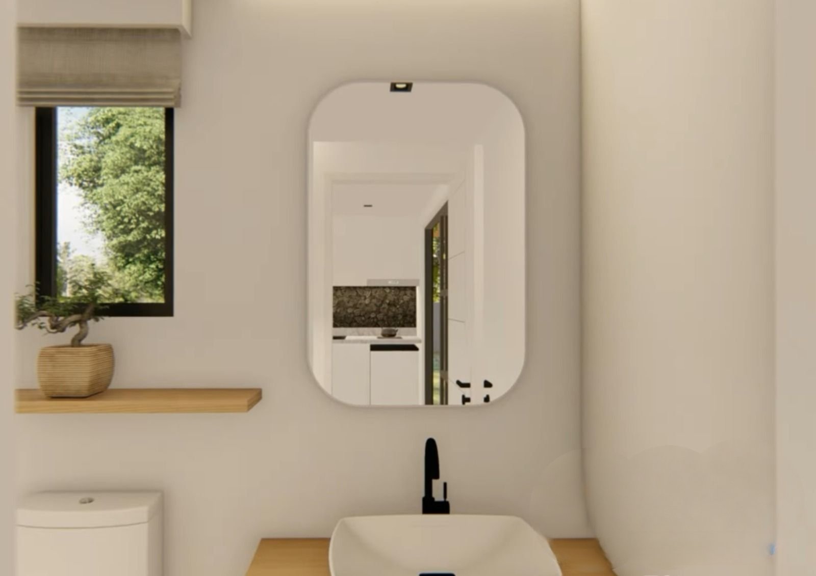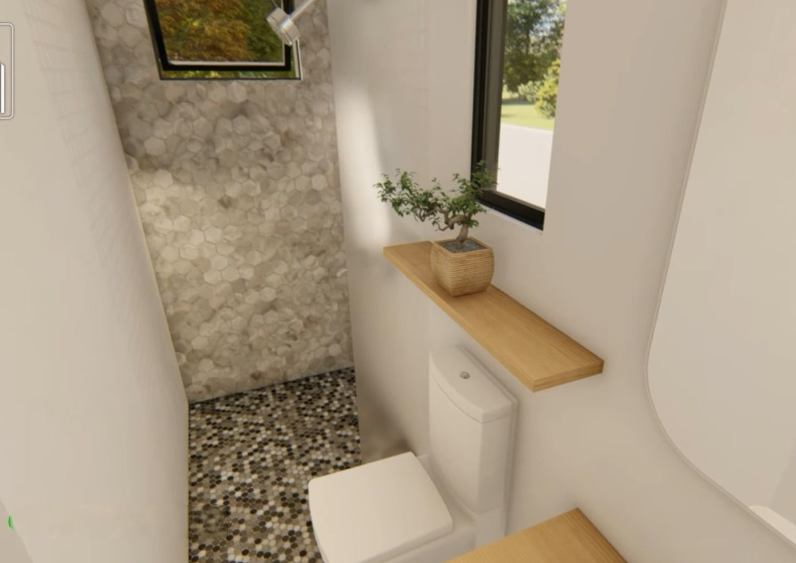 Ce chalet modulaire comprend un coin repas, une cuisine et une salle de bain intégrés, personnalisables selon les besoins du client. Sa surface au sol est de 5 m x 3 m, soit une surface totale de 15 m²