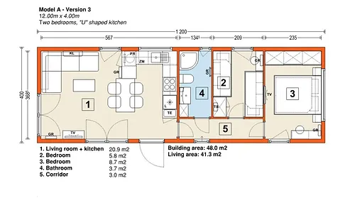 Modèle A – maison mobile sur roues.  C’est le type de maison le plus choisi par les clients. Le modèle A a une forme rectangulaire traditionnelle recouverte d’un toit doux. Il est disponible dans différents aménagements intérieurs fonctionnels. L’apparence extérieure, telle que la palette de couleurs, la sélection des matériaux et l’emplacement des fenêtres, peut être personnalisée pour répondre aux exigences du client.